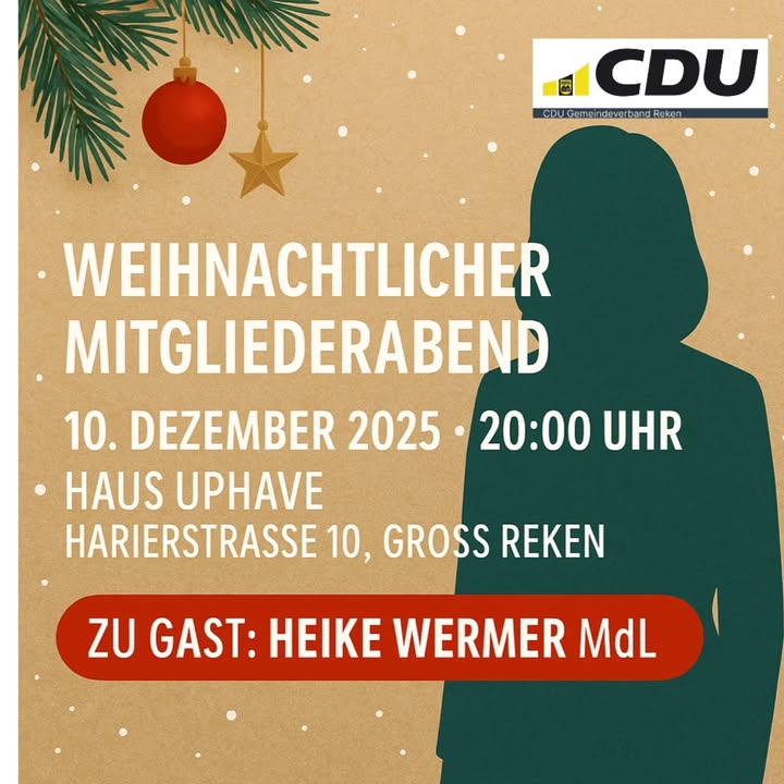 🎄 Weihnachtlicher Mitgliederabend der CDU Reken 🎄Am 10. Dezember 2025 laden wir alle Mitglieder herzlich zu unserem jährlichen, gemütlichen Ausklang des Jahres ein.📍 Haus Uphave, Groß Reken⏰ 20:00 UhrGemeinsam möchten wir das ereignisreiche politische Jahr ? geprägt von der Kommunalwahl ? Revue passieren lassen und auf unsere Erfolge anstoßen.Wir freuen uns besonders, Heike Wermer MdL, unsere frisch gewählte CDU-Kreisvorsitzende, an diesem Abend begrüßen zu dürfen. Sie wird sich vorstellen und spannende Einblicke aus der Landespolitik geben.✨ Bei Glühwein, Kaltgetränken und guten Gesprächen verbringen wir einen geselligen Abend in vorweihnachtlicher Atmosphäre.Wir freuen uns auf euch!
