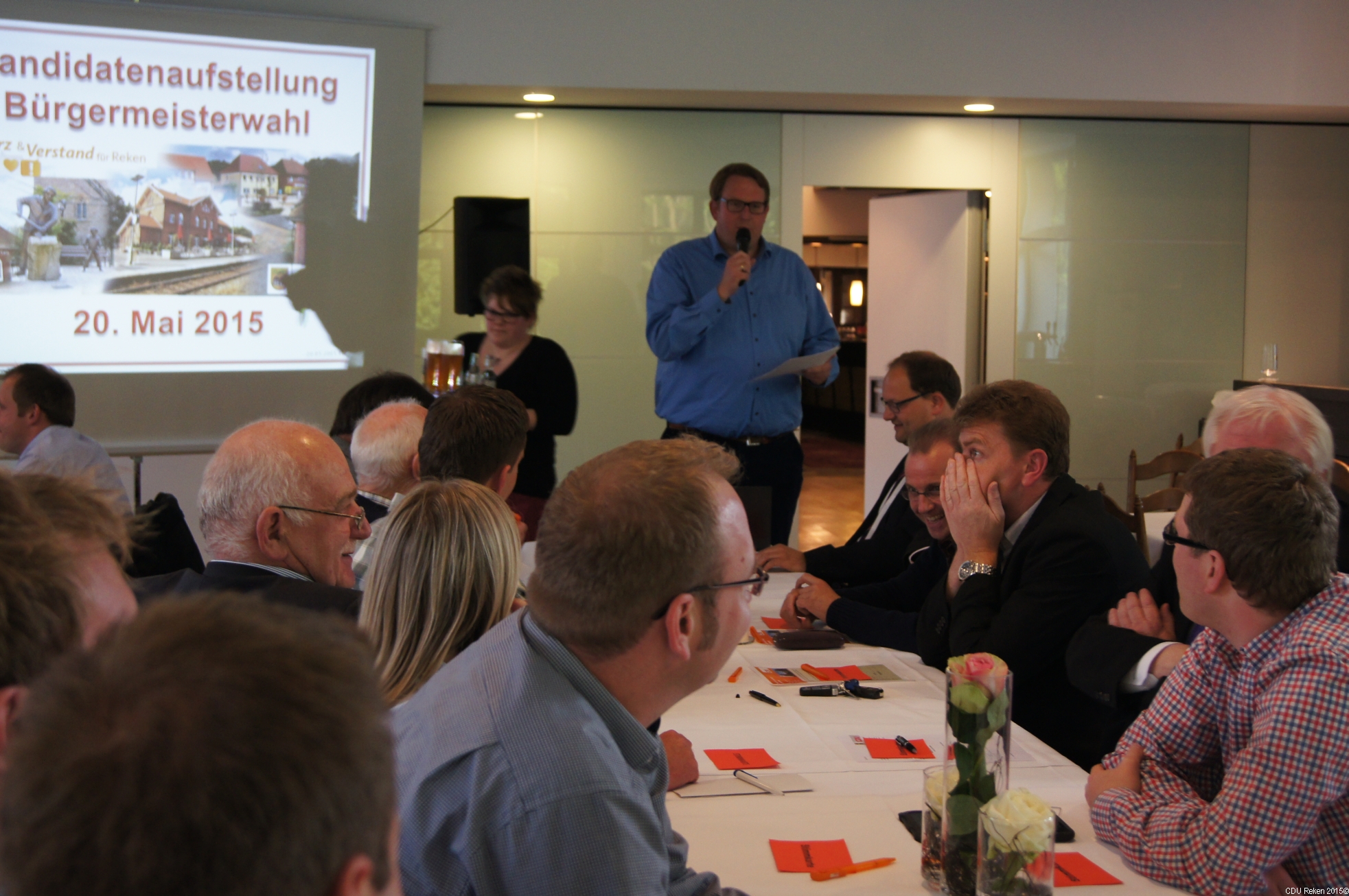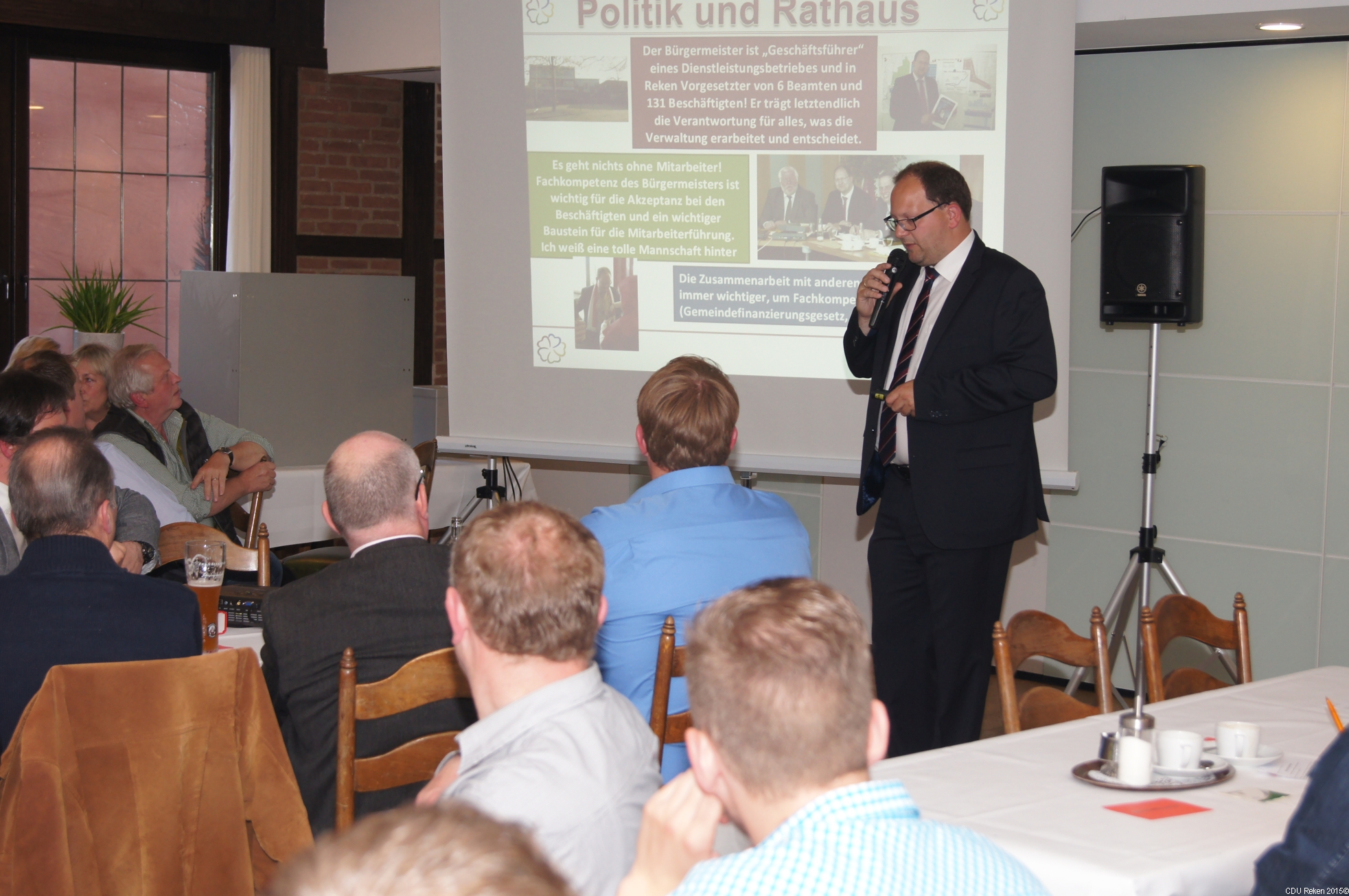 Der von Vorstand und Fraktion im Vorfeld einstimmig vorgeschlagene aktuelle Kämmerer der Gemeinde Reken, Manuel Deitert, erläuterte in einem ausführlichen Vortrag seine Ideen und Vorschläge für ein lebenswertes Reken. In der anschließenden geheimen Wahl wurde Manuel Deitert von dem Gremium mit großer Zustimmung gewählt. Während der Stimmauszählung berichtete Wilhelm Stilkenbäumer, Mitglied des Kreistages sowie der Landschaftsversammlung LWL, über aktuelle Themen aus der Kreispolitik.